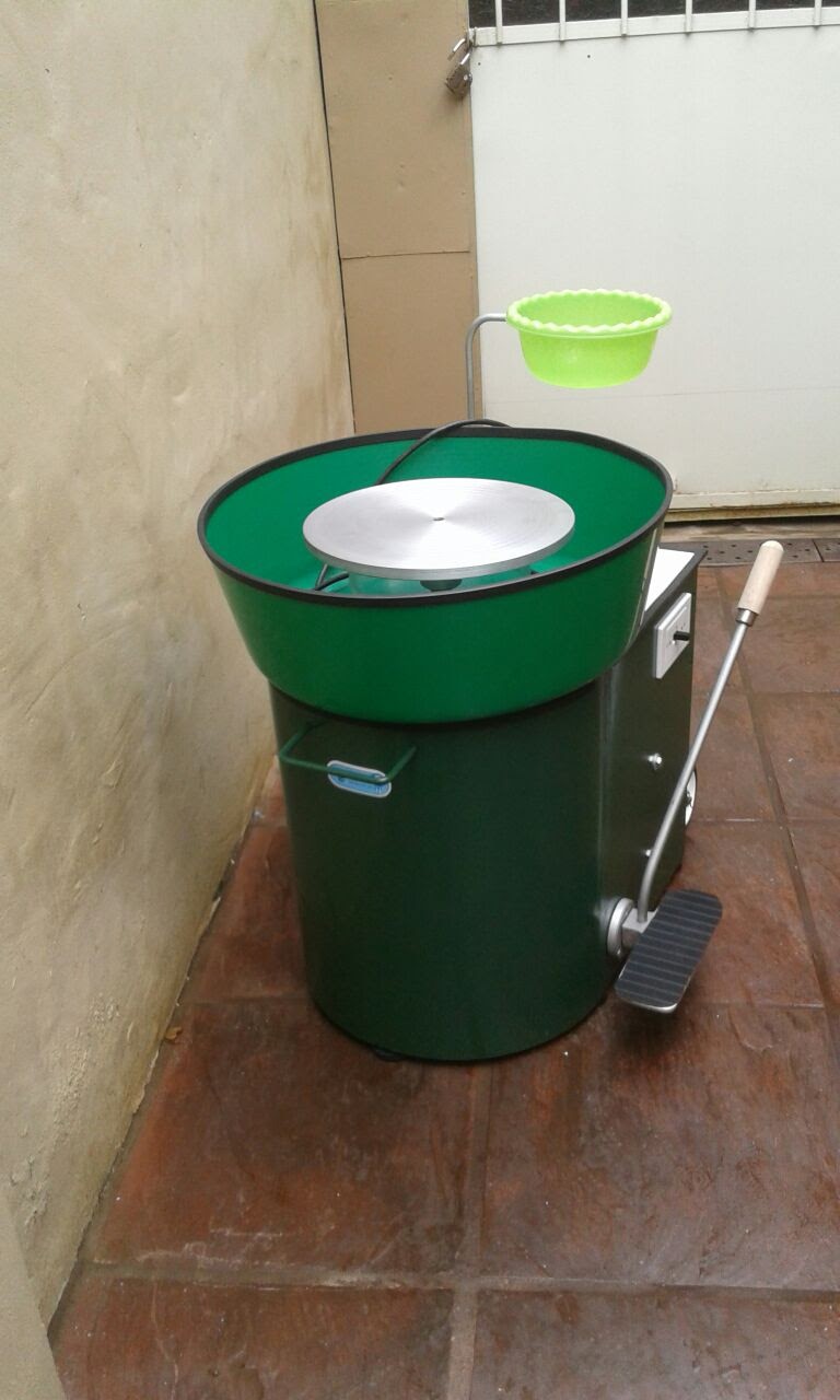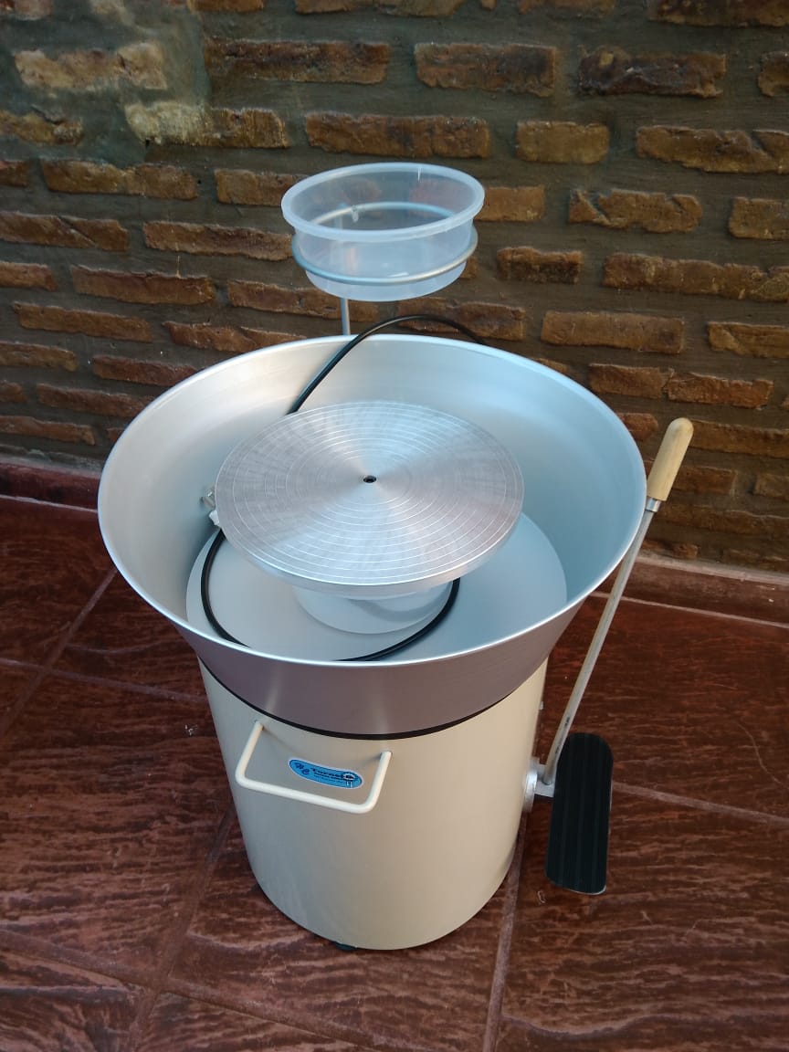 - Platina de aluminio de 290 mm de diámetro fijado sobre Cono, con llave de extracción y Eje montado sobre rodamientos autocentrante con bandeja de protección, libre de arcilla.